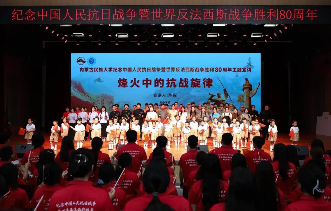 为纪念中国人民抗日战争暨世界反法西斯战争胜利80周年,9月6日晚,内蒙古民族大学在霍林河校区礼堂举办“烽火中的抗战旋律”主题宣讲活动。本次活动通过音乐与宣讲相结合的方式,引领广大师生重温抗战历史,感悟家国情怀。600余名师生聆听宣讲。