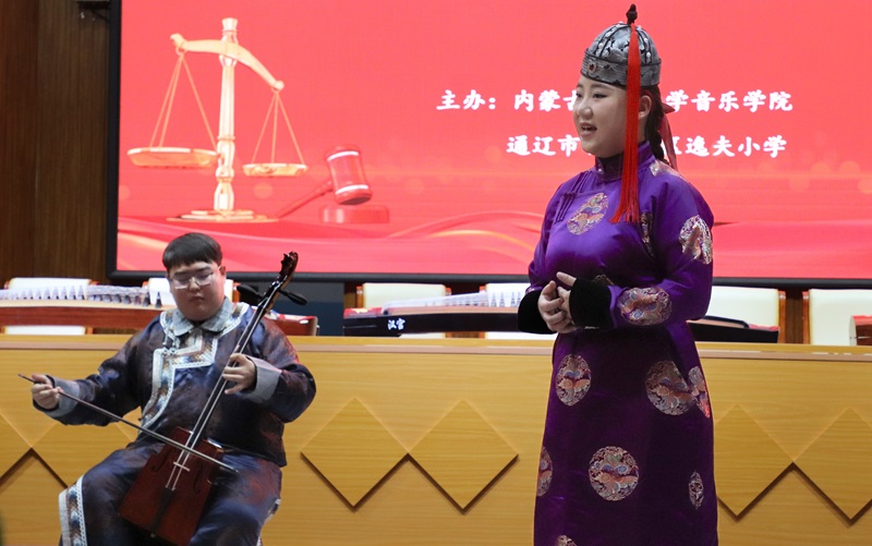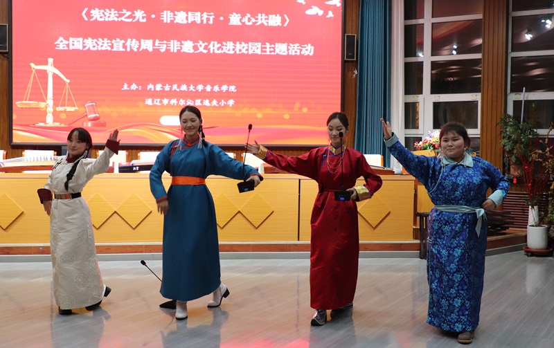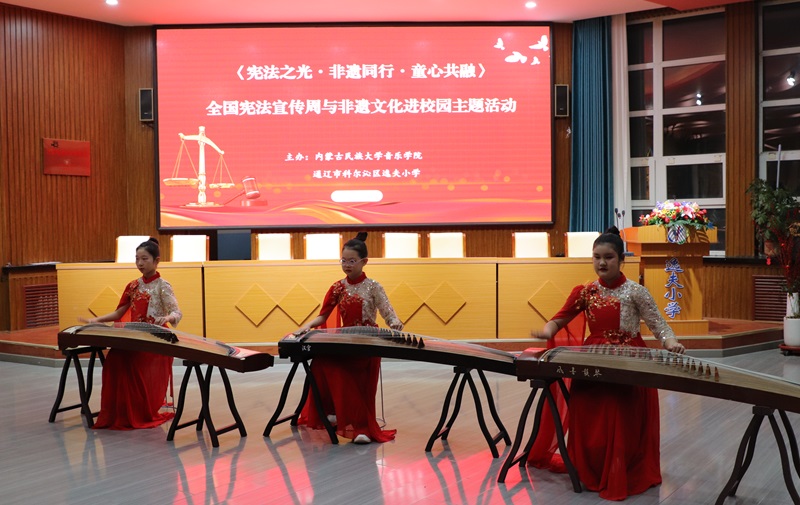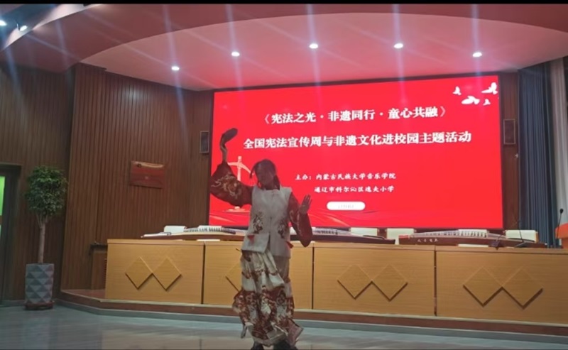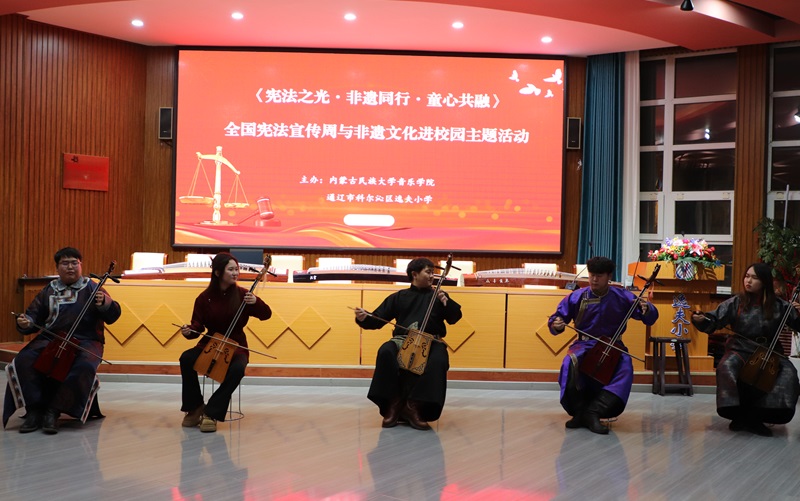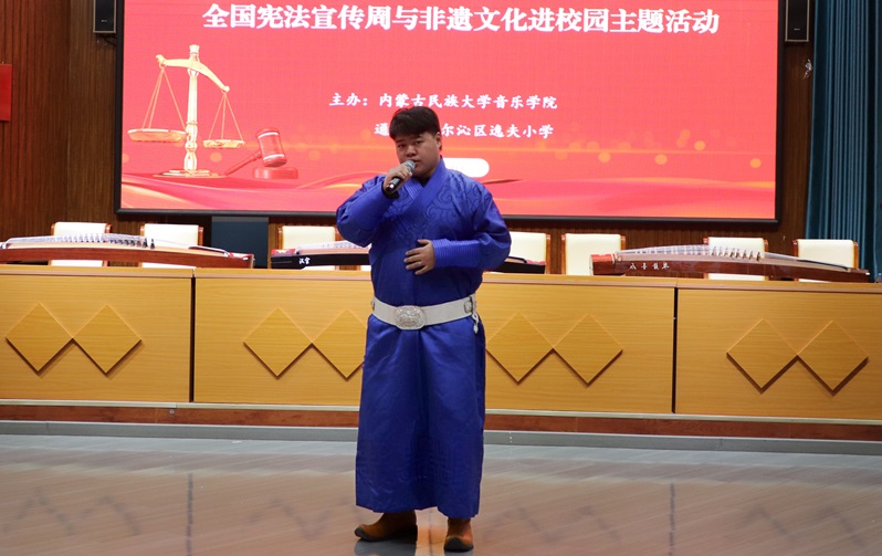 近日,在全国宪法宣传周期间,内蒙古民族大学音乐学院举办了“宪法之光·非遗同行·童心共融”全国宪法宣传周与非遗文化进逸夫小学主题活动,此次活动旨在通过非遗文化的展示与宪法知识的普及,让小学生们在感受传统文化魅力的同时,增强法治观念,争做新时代的守法小公民。