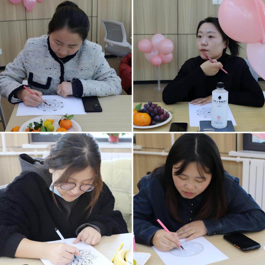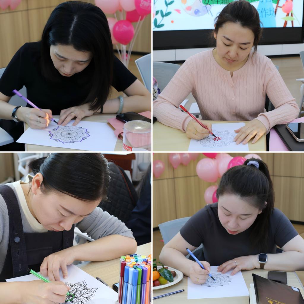 随后,安琪带领全体人员进入曼陀罗绘画艺术疗愈环节。她从曼陀罗的文化寓意与心理学应用切入,引导参与者通过自由选色与创作,将内在情绪转化为视觉化的艺术表达。在轻柔舒缓的背景音乐中,女性辅导员们全神贯注地投入到绘画之中,通过色彩与图形的巧妙组合,整理思绪,释放压力。活动尾声,全体成员围成一圈,共同参与了“能量传递”互动环节,彼此赋能,现场氛围温馨而充满正能量。