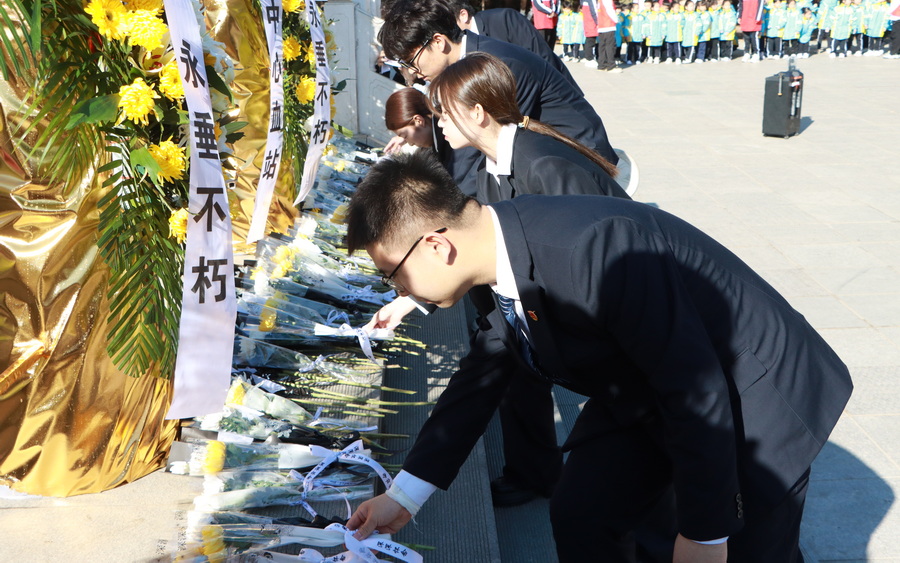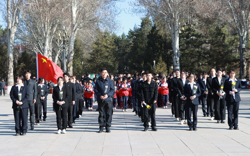 全体师生在烈士纪念碑前整齐列队、肃穆而立,面向纪念碑垂首默哀一分钟,向为国家和民族独立自由英勇献身的先烈致以深切哀悼。默哀仪式结束后,校国旗护卫队迈着坚定铿锵的步伐,代表全校师生向烈士纪念碑敬献花篮。花篮缎带上书写的“革命先烈永垂不朽”字样,寄托着师生对英烈的无限追思。随后,师生依次上前,手持白菊轻放于纪念碑前,以最朴素的方式表达对先烈的深切怀念与崇高敬意。