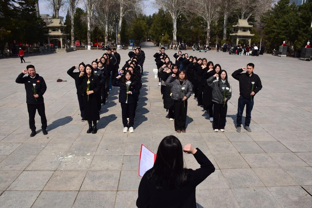 在庄严肃穆的革命烈士纪念碑前,全体师生整齐列队,肃立默哀,向为民族独立和人民解放事业英勇献身的革命先烈致以深切哀思。随后,辅导员老师向英雄烈士纪念碑敬献花圈,行礼。李冰艳以“铭记历史、传承精神、担当使命”为主题宣读缅怀辞,并带领全体师生庄严宣誓,承诺继承先烈遗志,弘扬革命精神。仪式最后,全体师生依次敬献鲜花,寄托对革命先烈的无限追思。