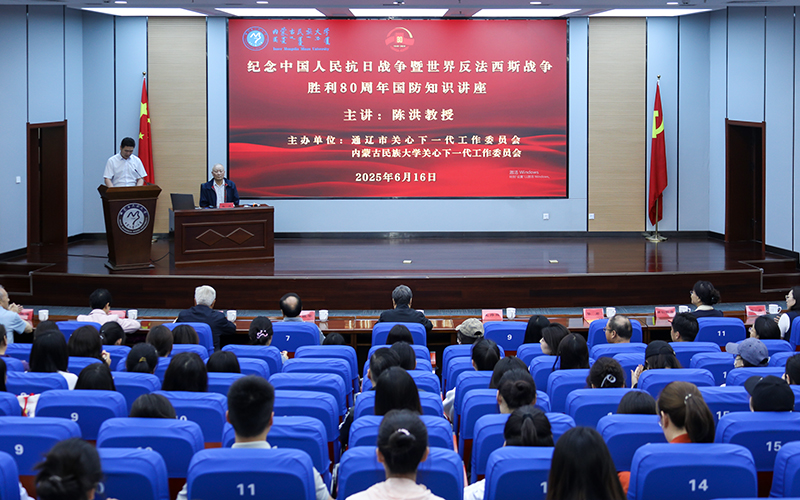 6月16日上午,我校关工委和通辽市关工委联合举办纪念中国人民抗日战争暨世界反法西斯战争胜利80周年国防知识讲座,邀请空军指挥学院陈洪教授(空军大校)担任主讲嘉宾。通辽市关工委常务主任张万忠、常务副主任王宝湖、副主任于艳君,我校党委副书记王烨辉、校关工委主任白跃华,校关工委、离退休工作处、学生处、团委等部门负责人,各学院党委副书记、辅导员和学生代表聆听讲座。王烨辉主持讲座。
